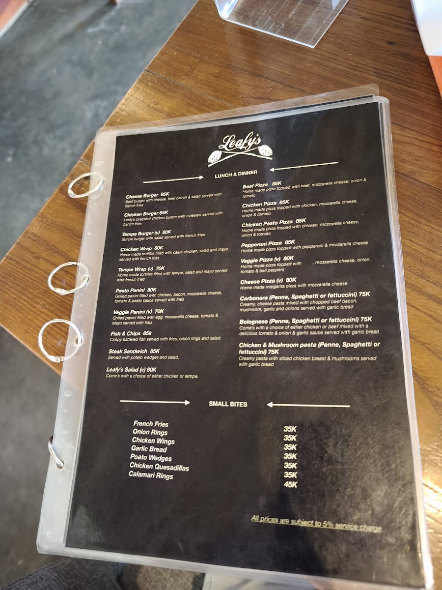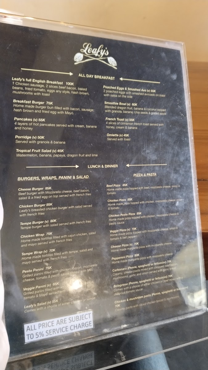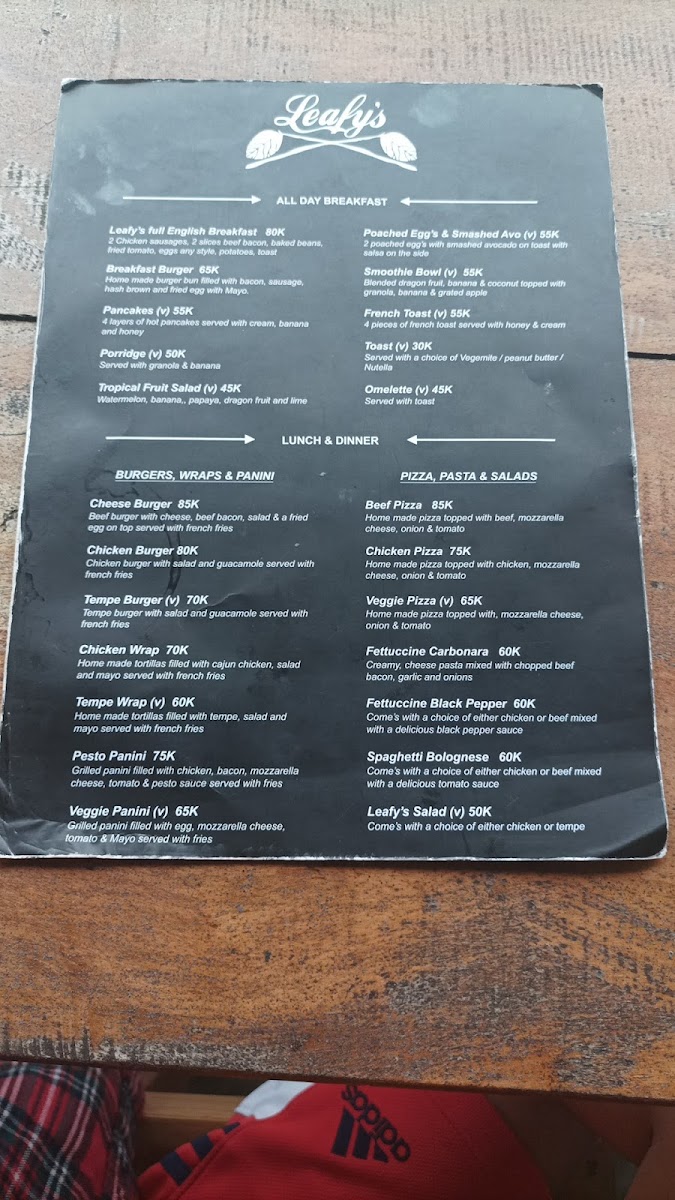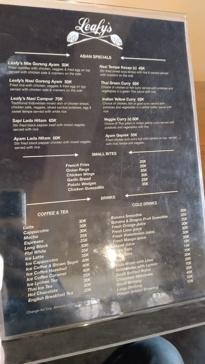 The menu at Leafy's Cafe offers a diverse selection suitable for various dining occasions, including breakfast, light meals, and casual dining. It features a range of beverages, including several coffee varieties such as long black coffee, cappuccino, kopi gula aren, kopi latte, and teh tarik, as well as refreshing options like lemon tea and fruit smoothies including banana and dragon fruit.
