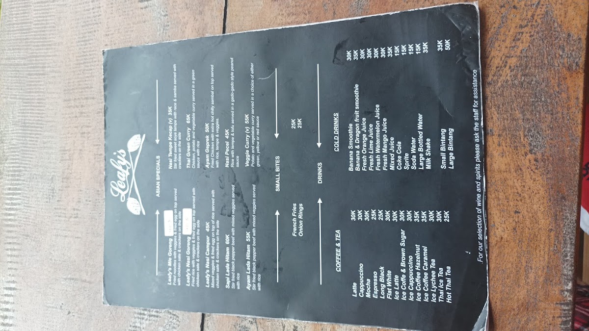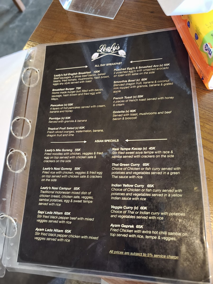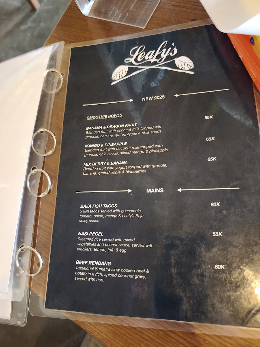 The menu at Leafy's Cafe offers a diverse selection suitable for various dining occasions, including breakfast, light meals, and casual dining. It features a range of beverages, including several coffee varieties such as long black coffee, cappuccino, kopi gula aren, kopi latte, and teh tarik, as well as refreshing options like lemon tea and fruit smoothies including banana and dragon fruit.
